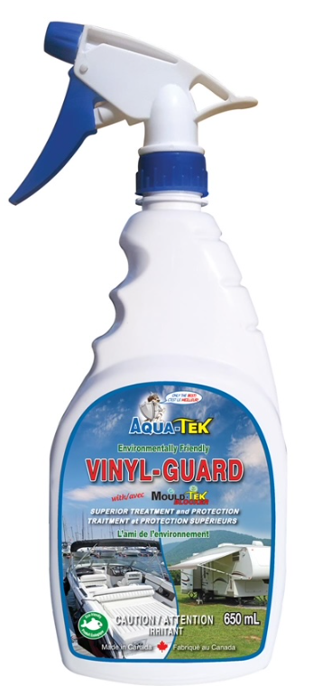 Vinyl-Guard penetrates on a nano level, anchoring itself to repel dirt, water and resist most stains (including tree sap) while revitalizing and restoring to leave original bright, fresh colour finish with superior UV protection. Provides long-lasting durable protection for vinyl, finished leather, plastic, acrylic, rubber, PVC, polyurethane, polyester, and hypalon on boats, water toys, awnings, pop-up trailers and convertible car tops. Unique, environmentally friendly formula is resistant to most cleaners and dries to a clear, non-slippery finish with no oily or greasy residue. Mould-Tek Blocker additive blocks stains due to mould and mildew.