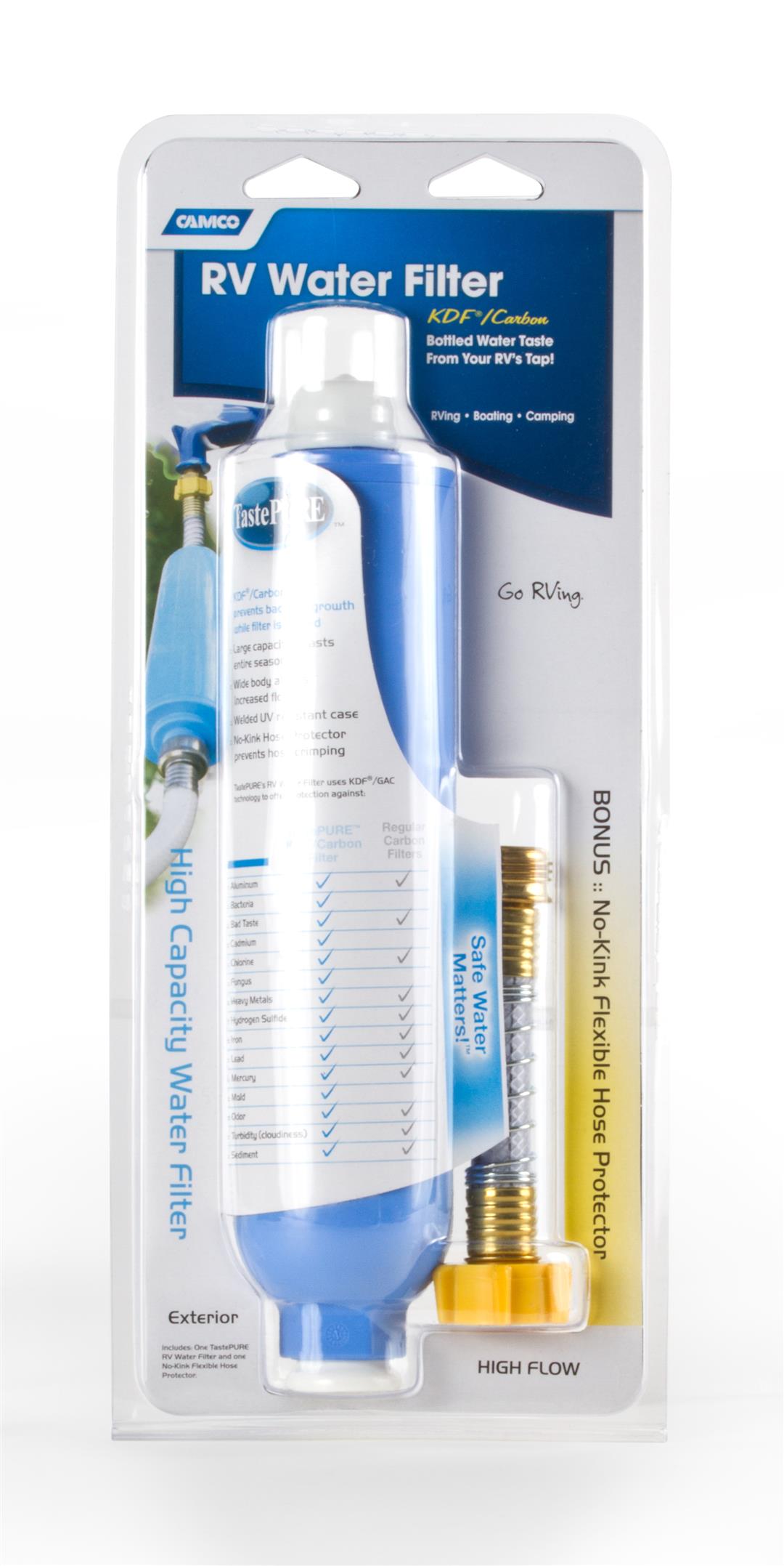 Fresh water filter; TastePURE ™; Fits standard garden hose female coupling for pre-tank filtering; In-line canister type; High-flow carbon filter with KDF; Removes bacteria/ heavy metals and chemicals; Filters down to 100 microns; With flexible hose protector; Single; With English language packaging
