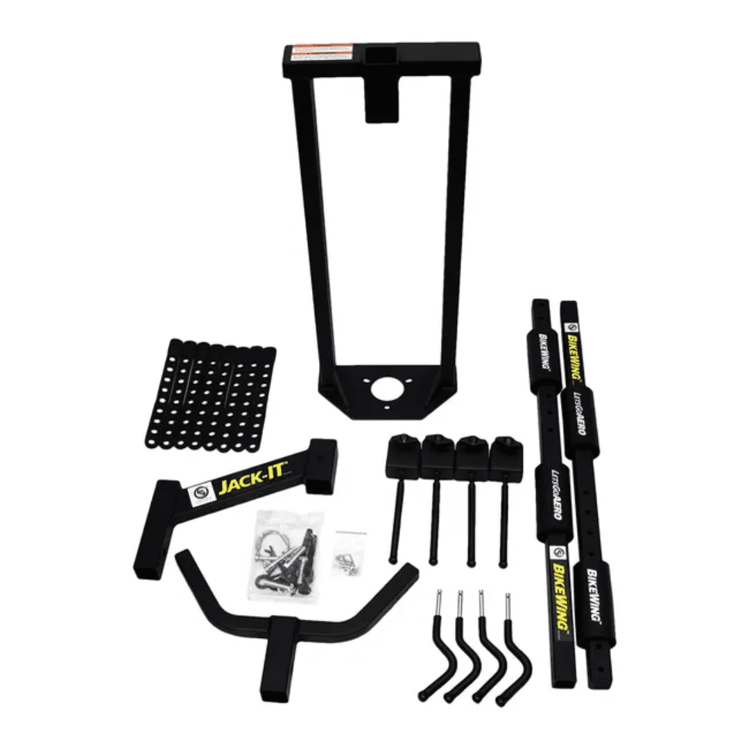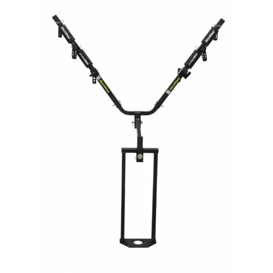 The Jack-It™ double bike carrier system lets you haul your bikes using your A-frame trailer — saving you space to haul more from your receiver hitch and giving you more visibility to your bikes while you’re on the road. The innovative frame design installs over the tongue jack on your trailer’s A-Frame, the softest riding area on the frame. The BikeWing carrier then holds two bikes safely, securely and simply by the wheels.