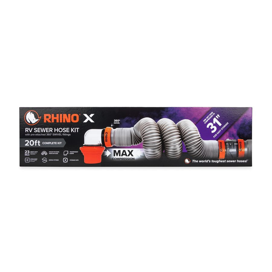 Sewer Hose; Rhino ™ X; 20 Foot Length; 23 Mil Polymer; Black Hose; With Two 10 Foot Length Hoses And Pre-Attached Swivel Lug And Swivel Bayonet Fittings/ Transparent Elbow/ 4-In-1 Adapter Fitting/ 4 Storage Caps